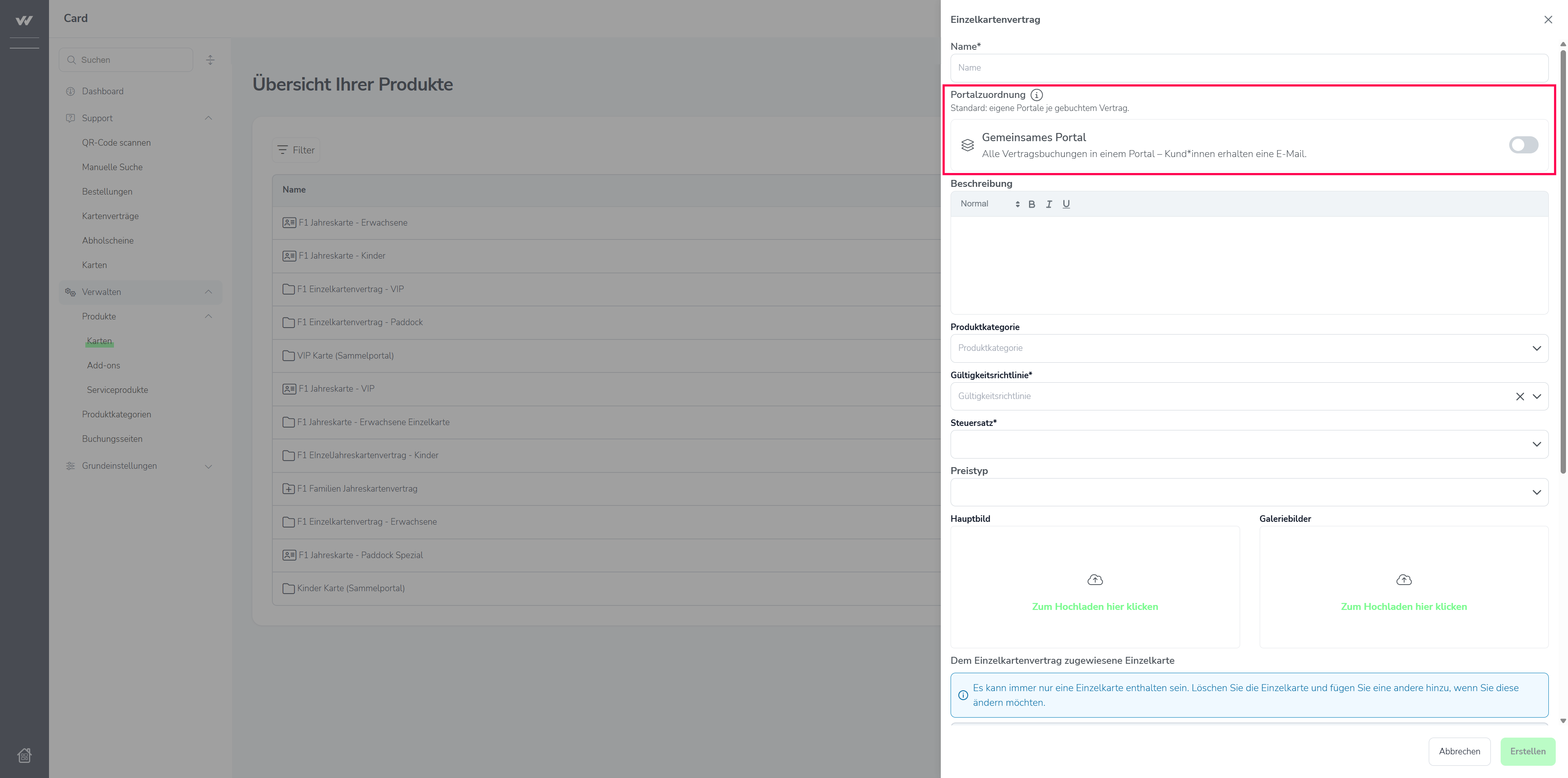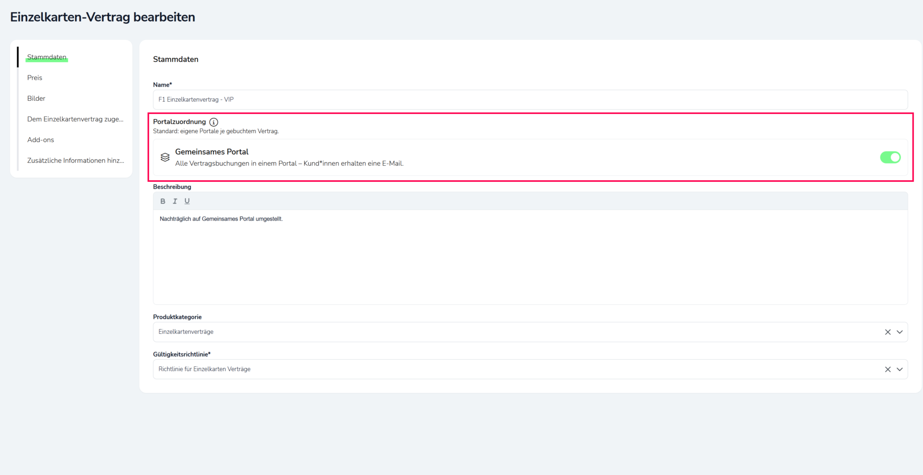 Beim Erstellen und Bearbeiten von Einzelkartenverträgen gibt es jetzt eine Möglichkeit zu entscheiden, ob diese in einem "Gemeinsamen Vertragsportal" zusammengefasst werden sollen. Standardmäßig ist diese Funktion deaktiviert.