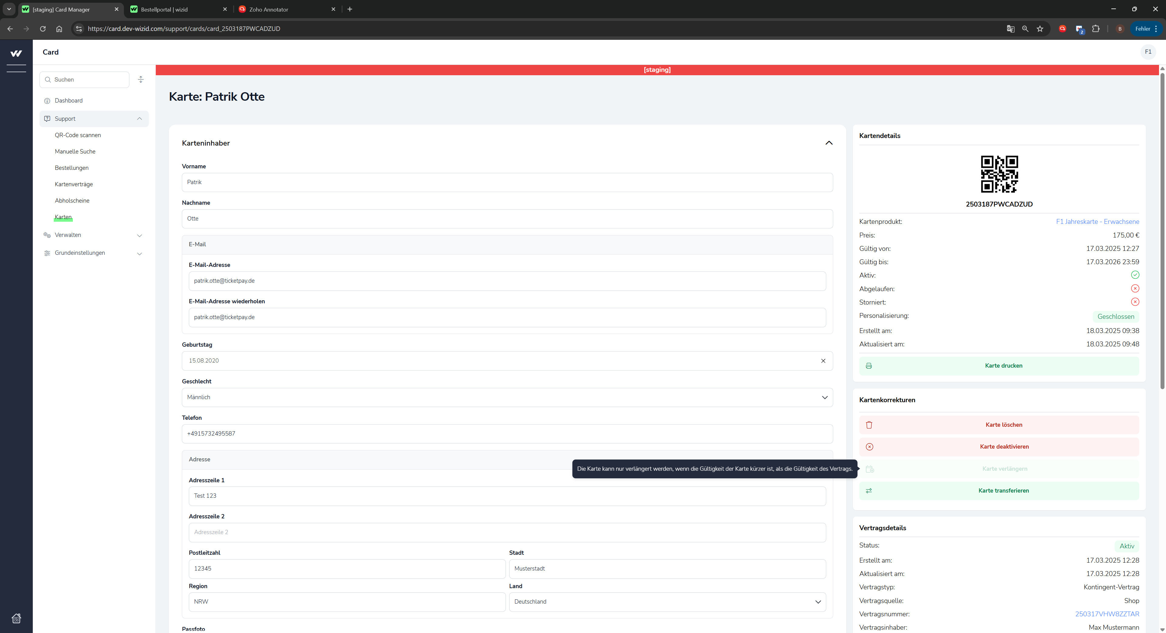 Was ist neu? Karten können jetzt von einem Vertrag in einen anderen verschoben werden – sofern bestimmte Voraussetzungen erfüllt sind. Voraussetzungen: Der Produkttyp (z. B. "Erwachsenenkarte") muss im Zielvertrag ebenfalls vorhanden sein. Im ...