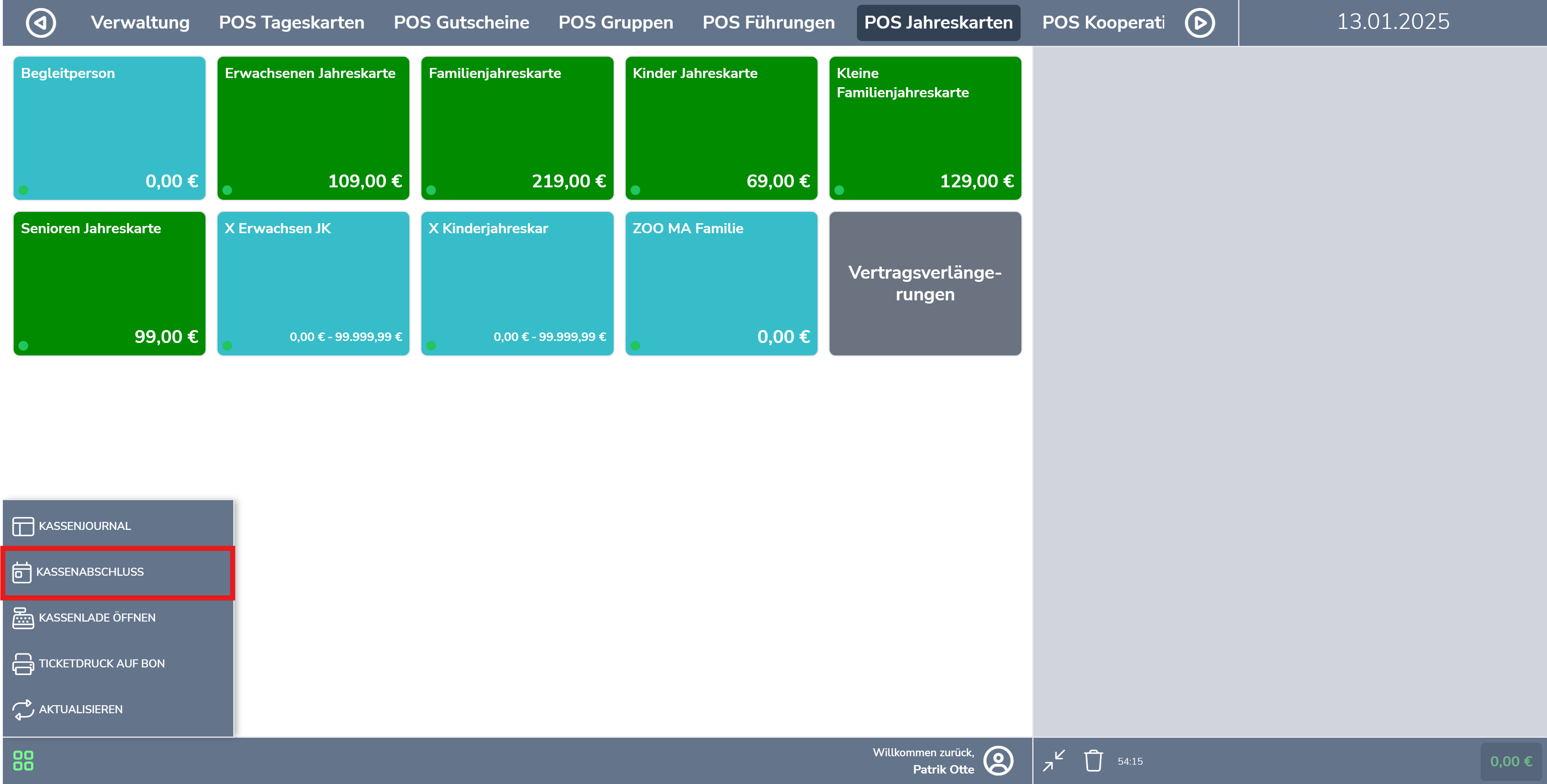 Um einen Kassenabschluss zu machen öffnen Sie über das Menü im POS Modul den Menüpunkt "Kassenabschluss".