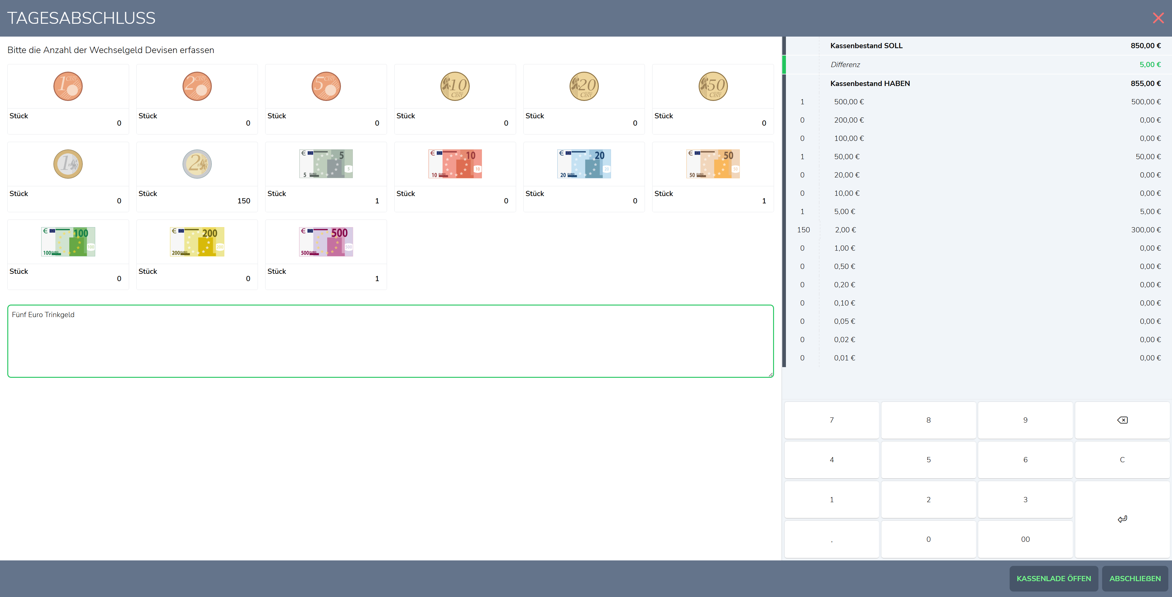 Wenn Sie den Menüpunkt Kassenabschluss öffnen werden Sie als nächstes aufgefordert den aktuellen Bestand an Bargeld in der Kasse zu zählen. Sie haben also die Möglichkeit ganz ohne Zählbrett ihren Bargeldbestand zu erfassen. Auf der rechten Seite sehen Sie die aktuelle Differenz aus SOLL und HABEN. Das SOLL errechnet sich dabei aus dem Bargeldbestand vom Anfang zzgl. untertägig verbuchten Barumsätze. Sofern es zu einer Differenz kommt haben Sie in einem Kommentarfeld die Möglichkeit die Differenz zu begründen.