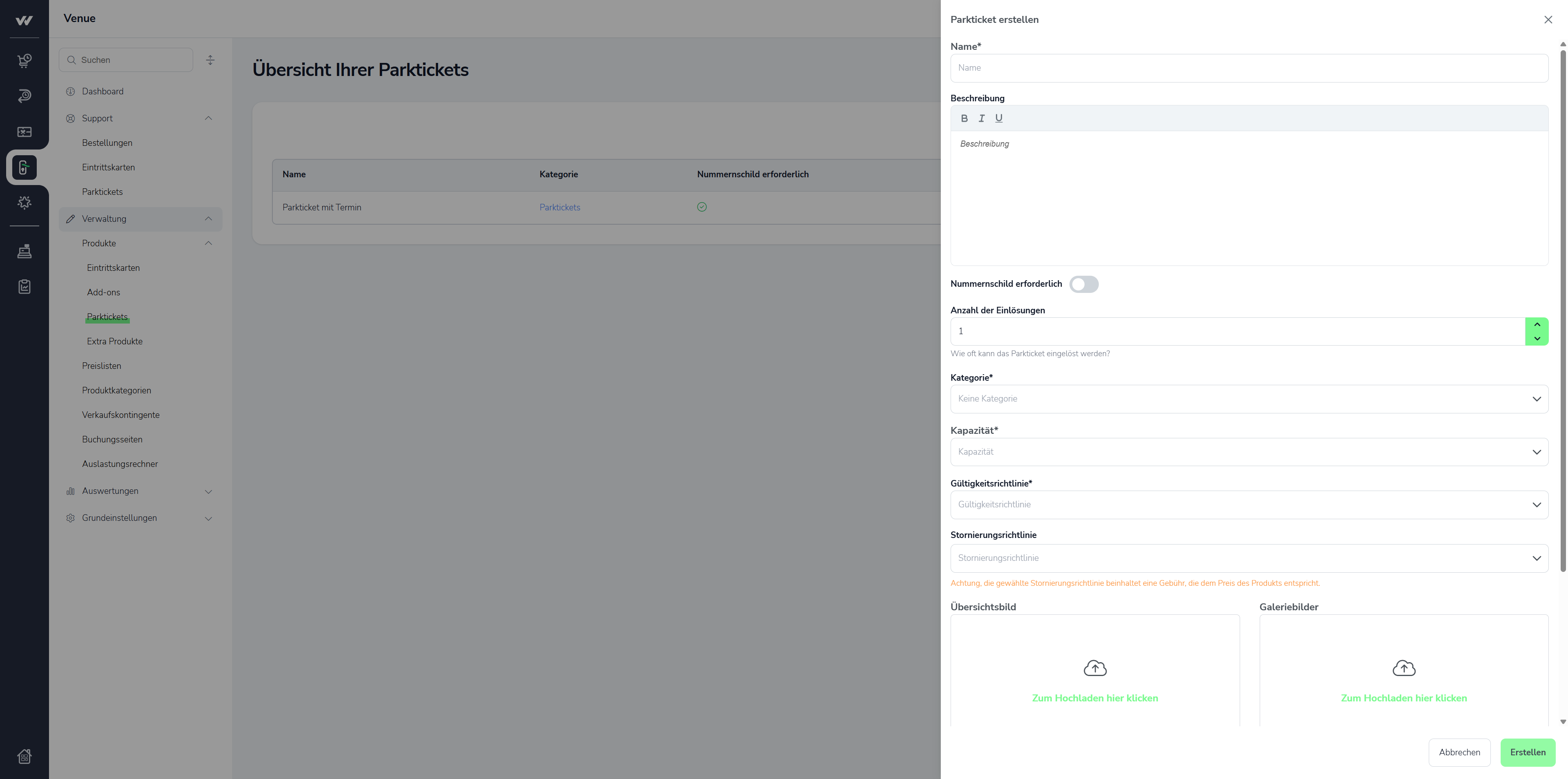 Wählen Sie unter „Verwaltung“ und „Produkt“ dann "Parktickets“ aus.