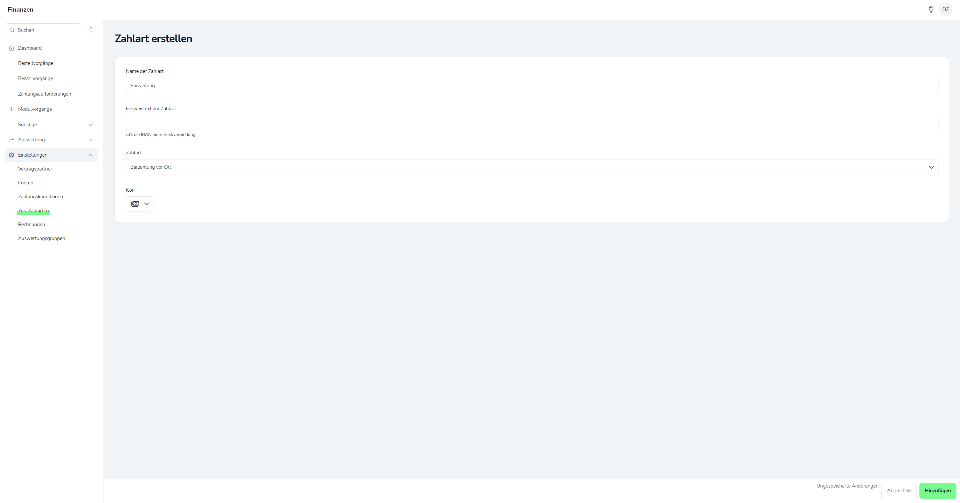 Anschließend klicken Sie unten rechts auf hinzufügen und wiederholen den Vorgang für jede Zahlart, welche Sie an ihrer Kasse anbieten möchten.