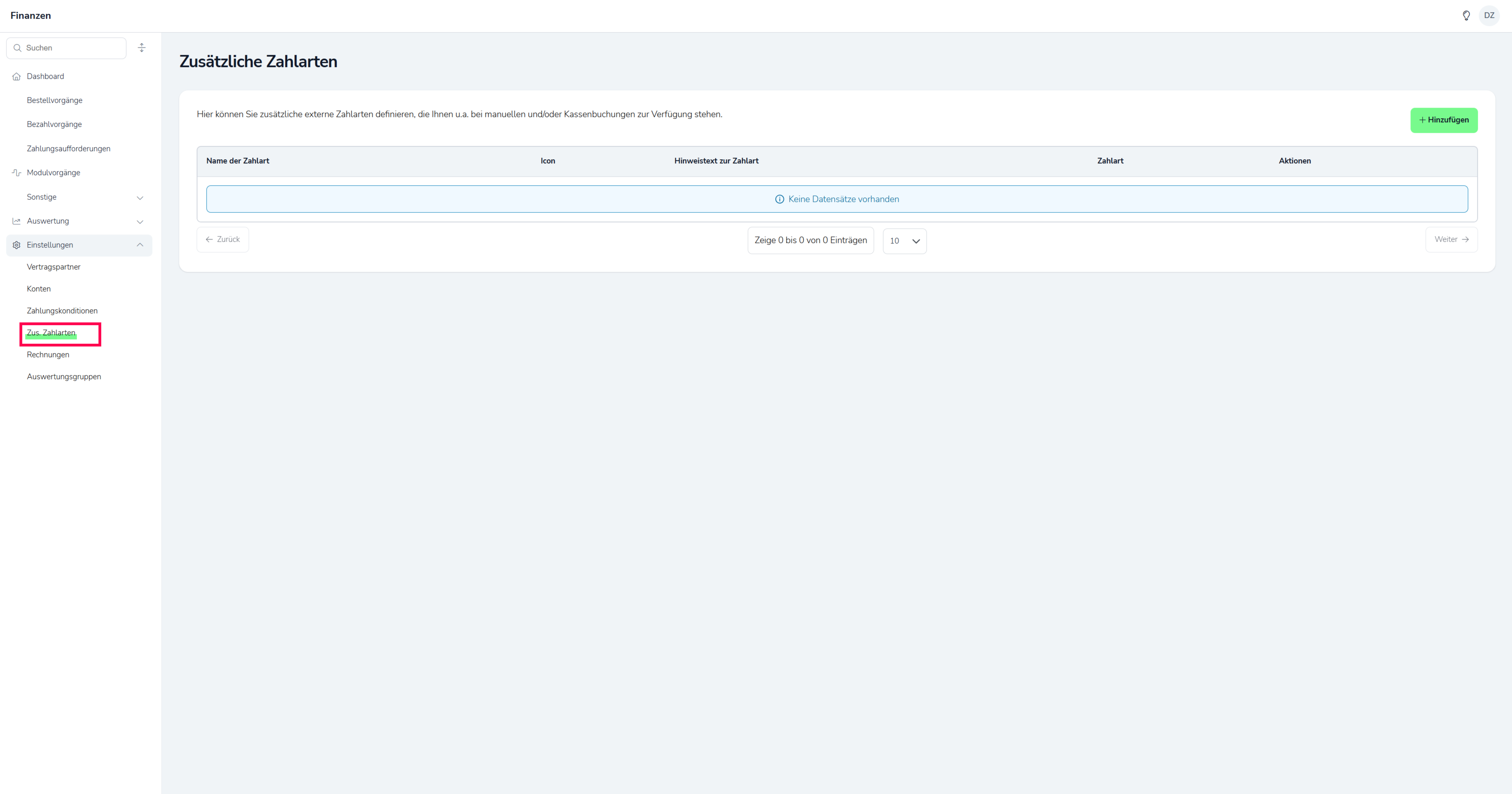 Um mit ihrem POS Modul auch Zahlungen entgegen nehmen zu können, die nicht rein digital sind, richten Sie bevor Sie mit der Konfiguration ihres POS Moduls beginnen die Zusätzlichen Zahlarten ein. Diese finden Sie "Einstellungen" und dann "Zus. Zahlarten". Um eine neue Zusätzliche Zahlart anzulegen klicken Sie auf den "Hinzufügen" Button oben rechts.