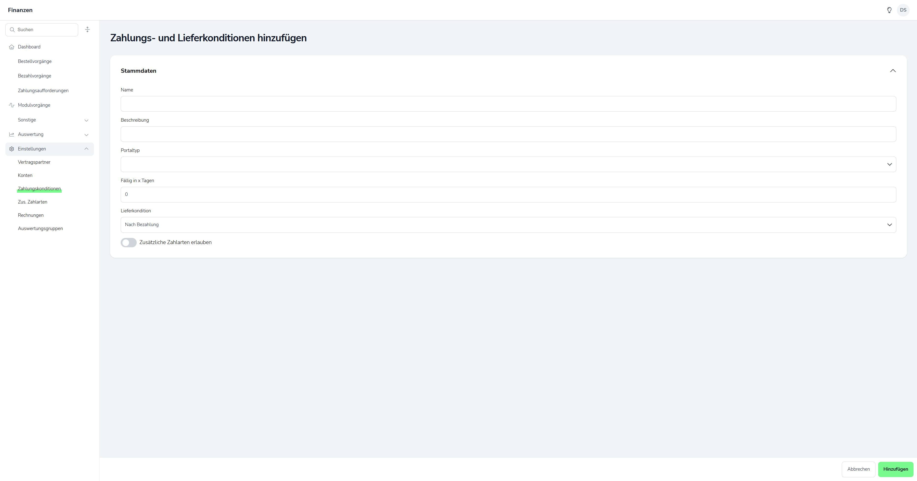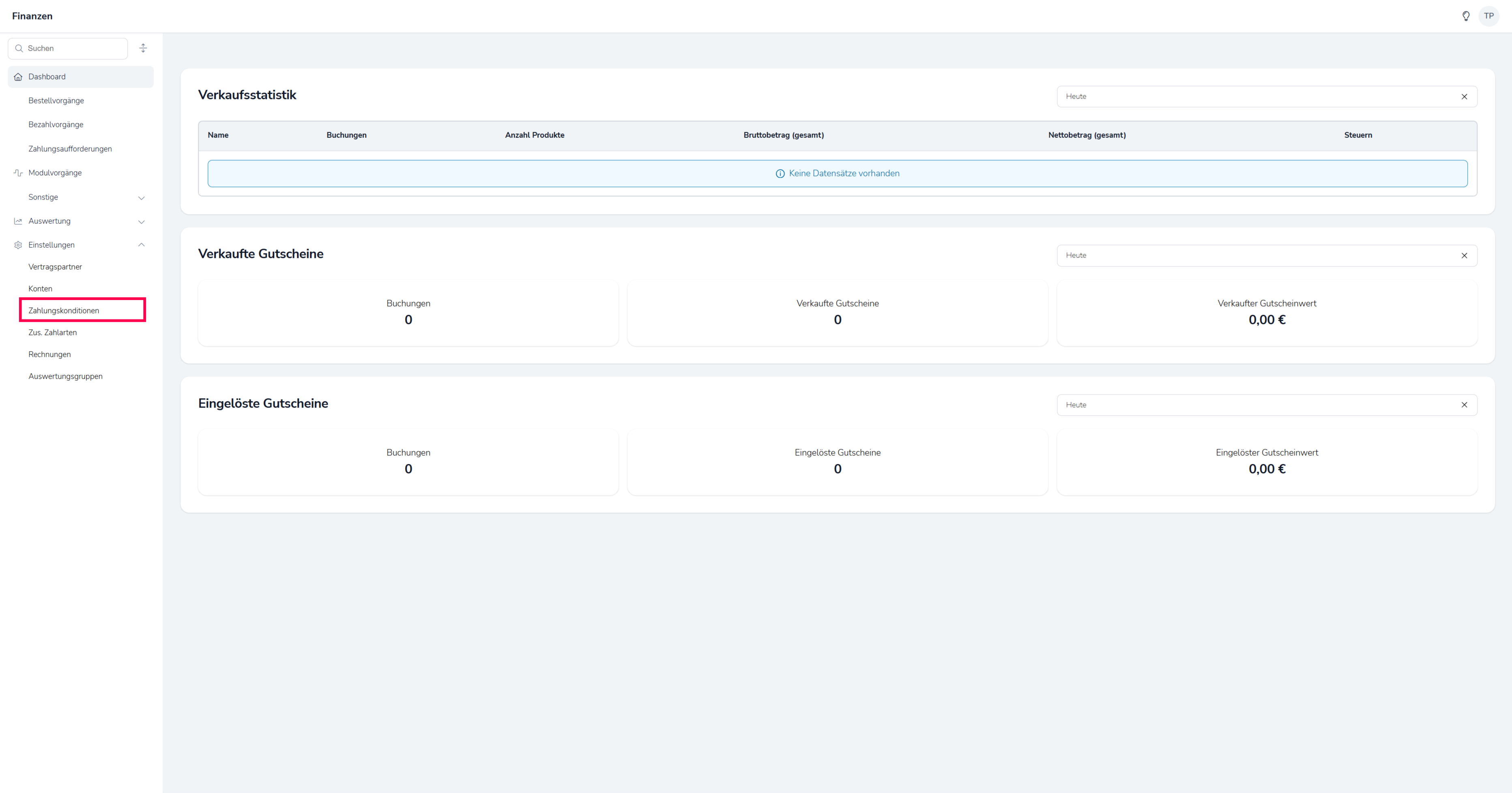 Ehe mit der Einrichtung des POS Moduls begonnen werden kann, bedarf es ein wenig Vorbereitung, um bei der Einrichtung nicht ins Stocken zu kommen. Zu beginn begeben Sie sich ins Modul Finanzen und dort unter "Einstellungen" in den Menüpunkt Zahlungskonditionen.