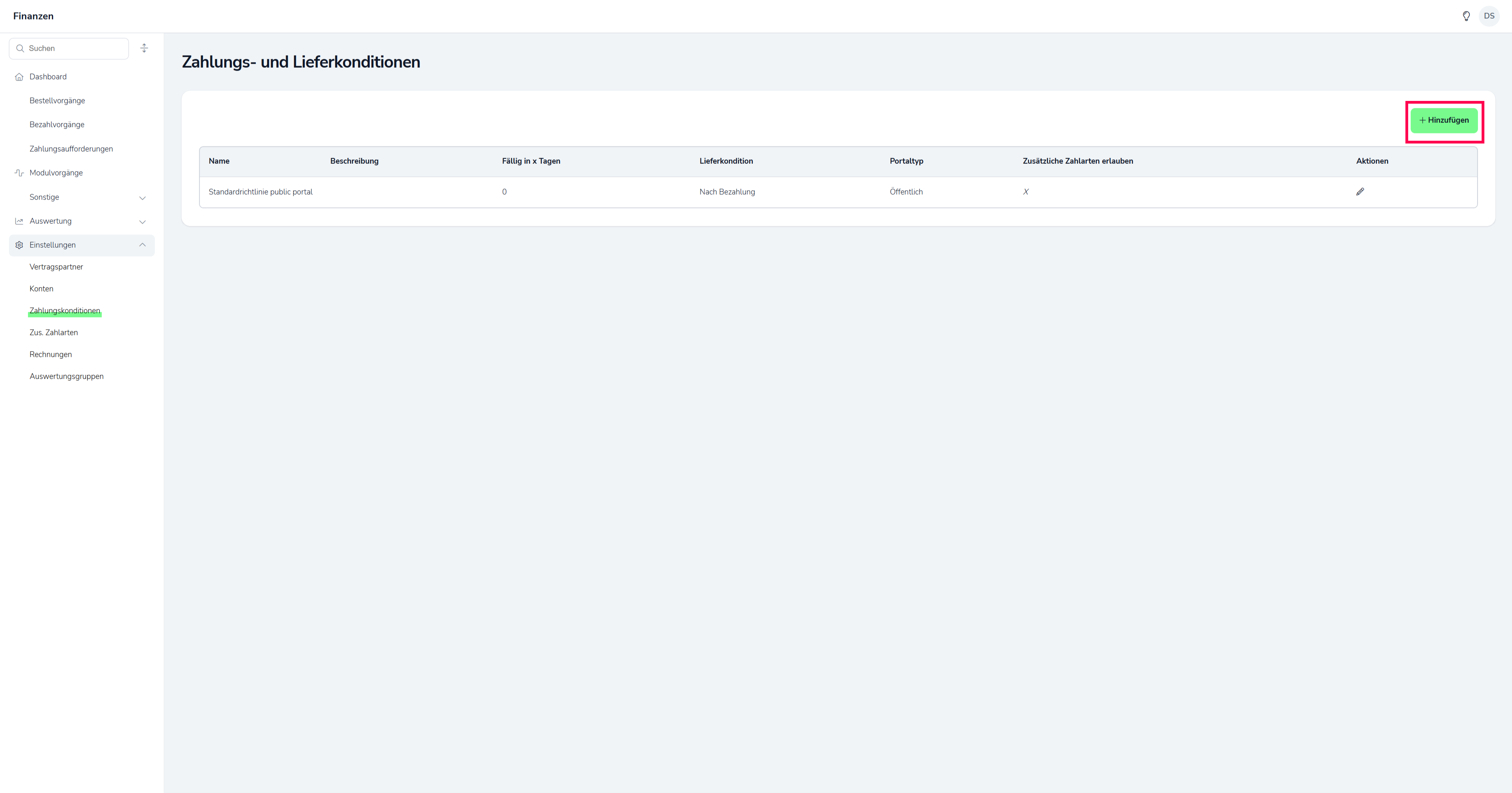 Dort finden Sie eine Übersicht aller eingerichteten Zahl- und Lieferkonditionen. Je Portaltyp (Öffentlich, Intern und Kasse) muss jeweils eine Zahl- und Lieferkondition eingerichtet werden, somit legen Sie über den "+ Hinzufügen" Button rechts oben eine neue Zahlungs- und Lieferkondition an bevor Sie mit der Einrichtung des POS Moduls beginnen.